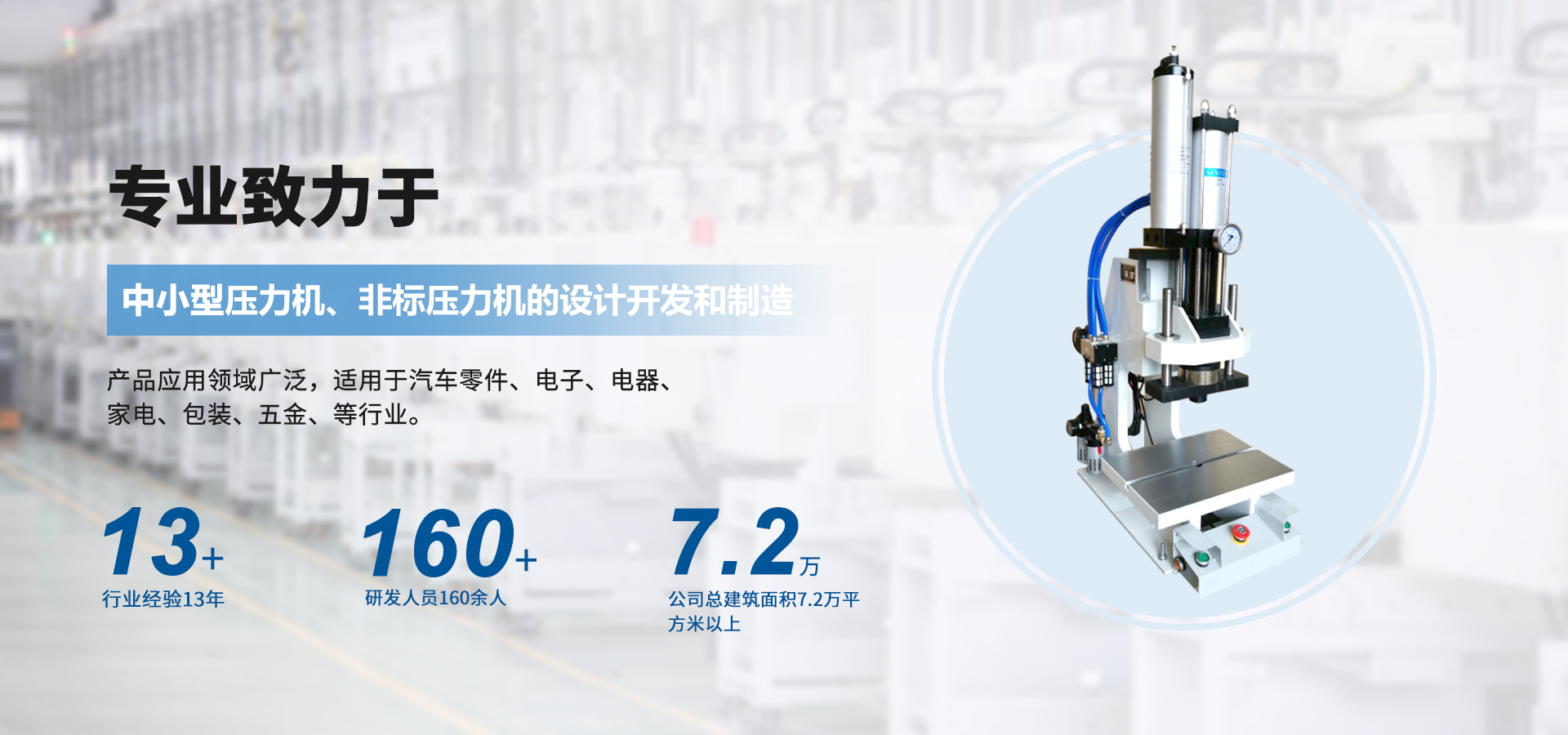 煙臺(tái)壟鑫沖壓設(shè)備有限公司是集經(jīng)營(yíng)、生產(chǎn)、技術(shù)開(kāi)發(fā)為一體的經(jīng)濟(jì)實(shí)體,專(zhuān)業(yè)致力于中小型壓力機(jī)、非標(biāo)壓力機(jī)的設(shè)計(jì)開(kāi)發(fā)和制造。在引進(jìn)德國(guó)、日本等國(guó)家先進(jìn)的鉚壓控制技術(shù)及機(jī)器設(shè)計(jì)理念的基礎(chǔ)上,結(jié)合相關(guān)行業(yè)的實(shí)際需要,開(kāi)發(fā)出各種臺(tái)式、落地式氣動(dòng)壓力機(jī)、手動(dòng)壓力機(jī)、氣液增壓機(jī)、氣液增力缸、旋鉚機(jī)、無(wú)鉚釘鉚接機(jī)等鉚接設(shè)備。產(chǎn)品應(yīng)用領(lǐng)域廣泛,適用于汽車(chē)零件、電子、電器、家電、包裝、五金、等行業(yè)。公司視質(zhì)量為生命,并一貫遵循對(duì)每一臺(tái)產(chǎn)品負(fù)責(zé),對(duì)每一位用戶負(fù)責(zé),真誠(chéng)為您服務(wù)。